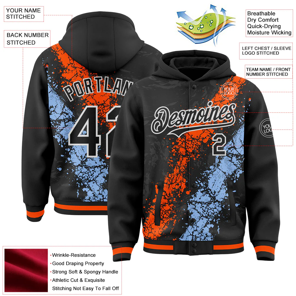 Custom Black Orange Light Blue-White Splash Art 3D Pattern Design Bomber Full-Snap Varsity Letterman Hoodie Jacket