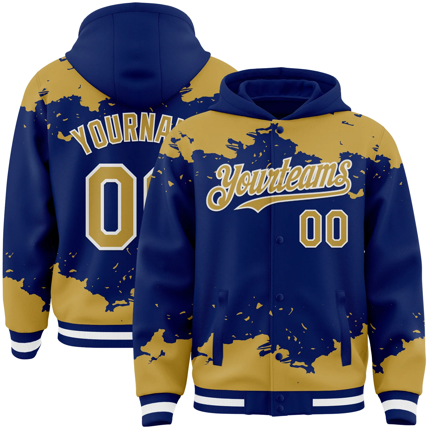 Custom Royal Old Gold-White Splash Art 3D Pattern Design Bomber Full-Snap Varsity Letterman Hoodie Jacket