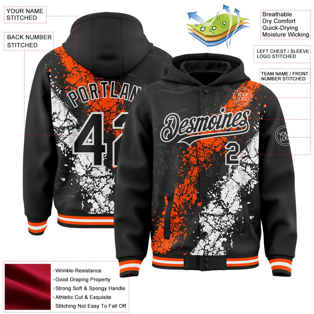 Custom Black Orange-White Splash Art 3D Pattern Design Bomber Full-Snap Varsity Letterman Hoodie Jacket