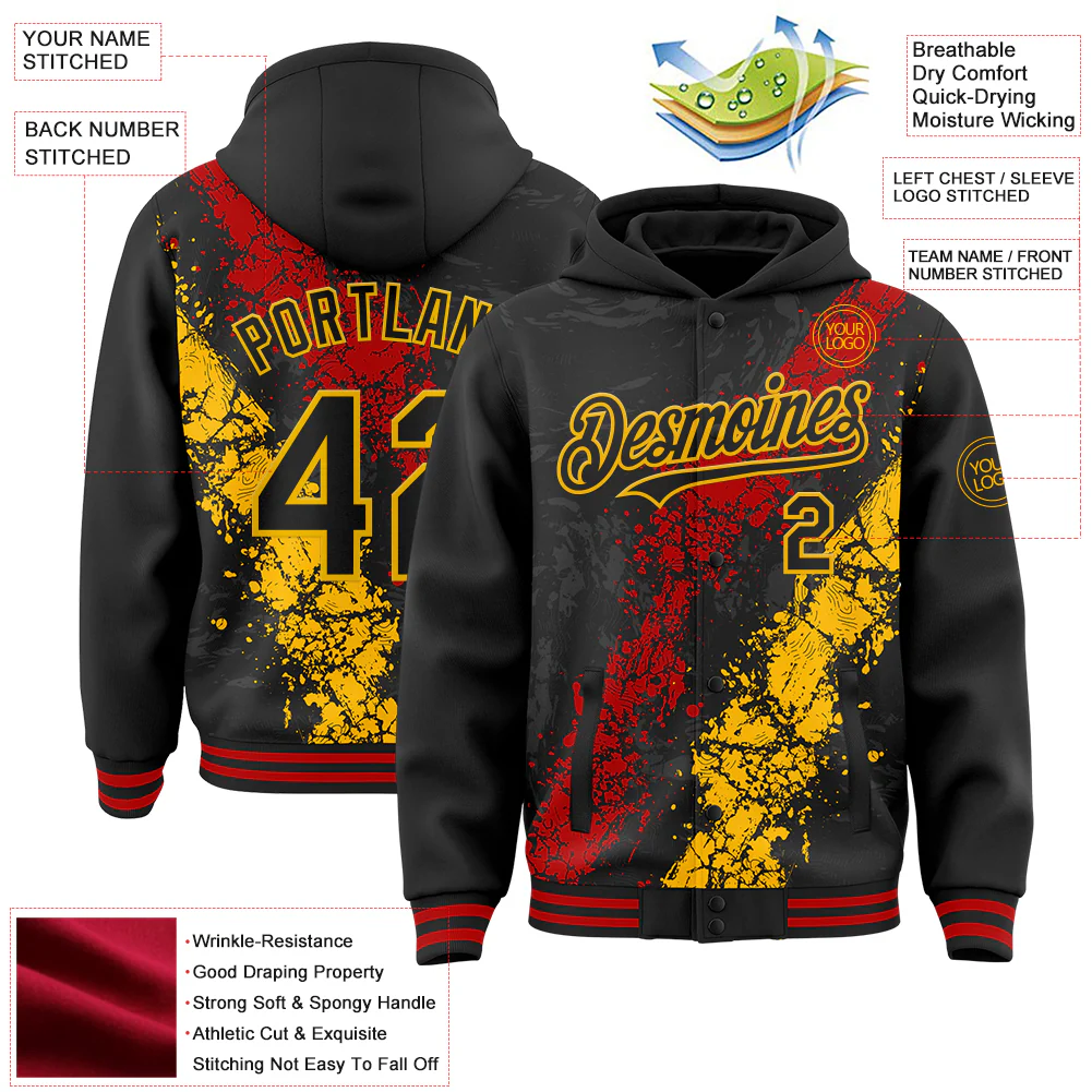 Custom Black Red-Gold Splash Art 3D Pattern Design Bomber Full-Snap Varsity Letterman Hoodie Jacket