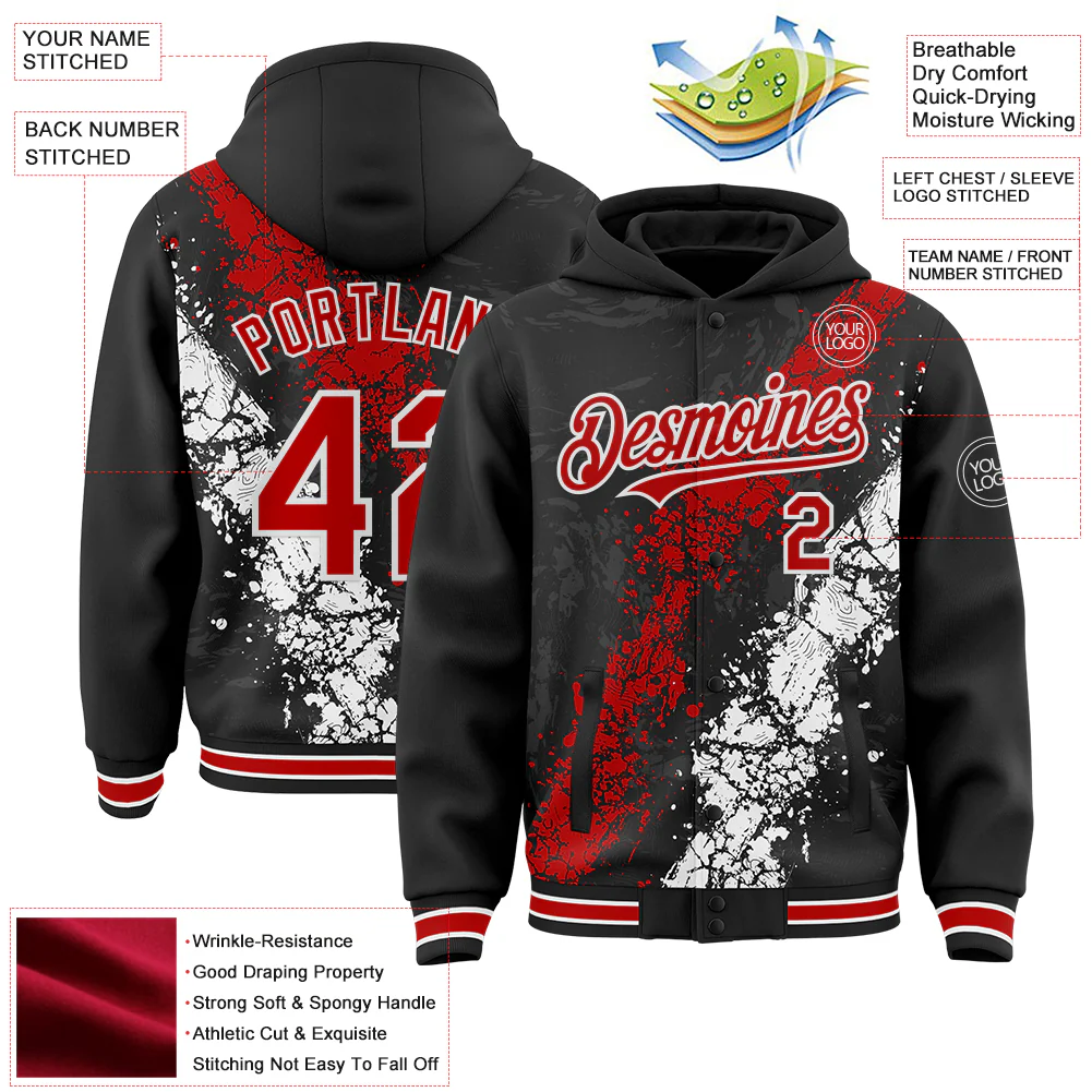 Custom Black Red-White Splash Art 3D Pattern Design Bomber Full-Snap Varsity Letterman Hoodie Jacket