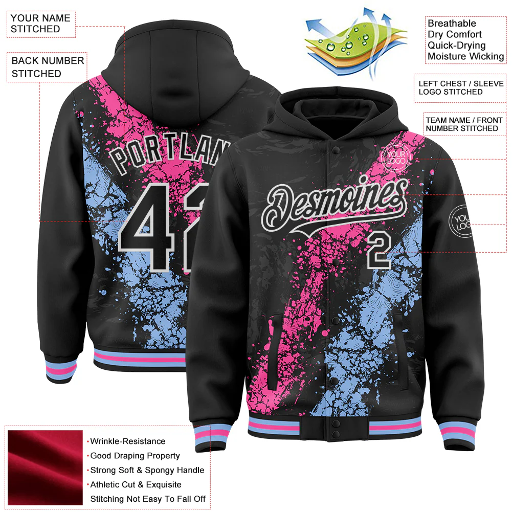 Custom Black Pink Light Blue-White Splash Art 3D Pattern Design Bomber Full-Snap Varsity Letterman Hoodie Jacket