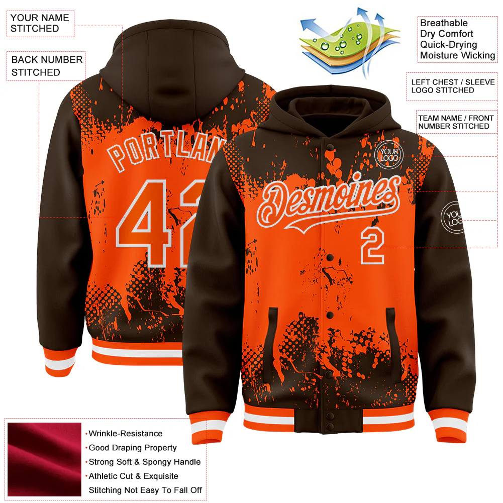 Custom Brown Orange-White Splash Art 3D Pattern Design Bomber Full-Snap Varsity Letterman Hoodie Jacket
