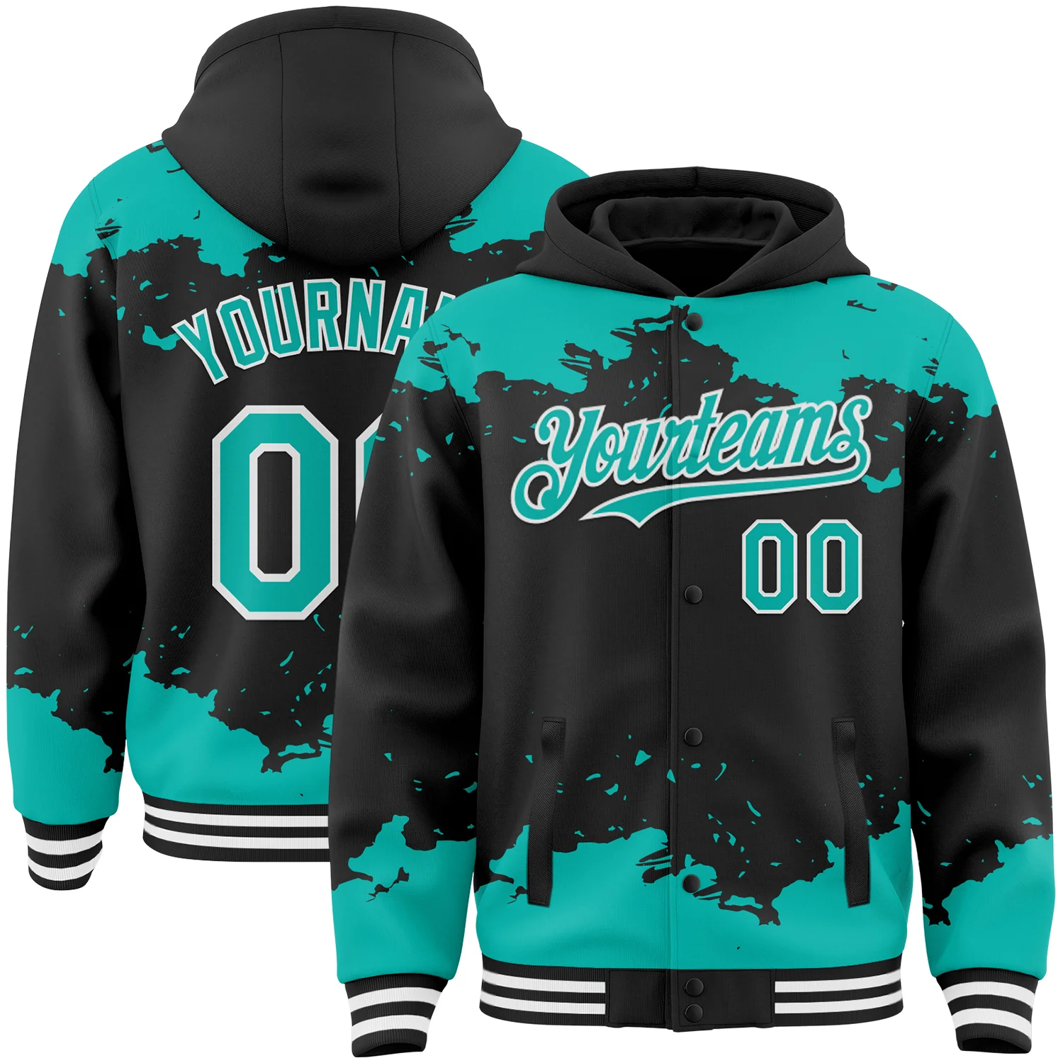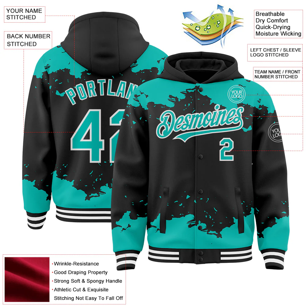 Custom Black Teal Splash Art 3D Pattern Design Bomber Full-Snap Varsity Letterman Hoodie Jacket