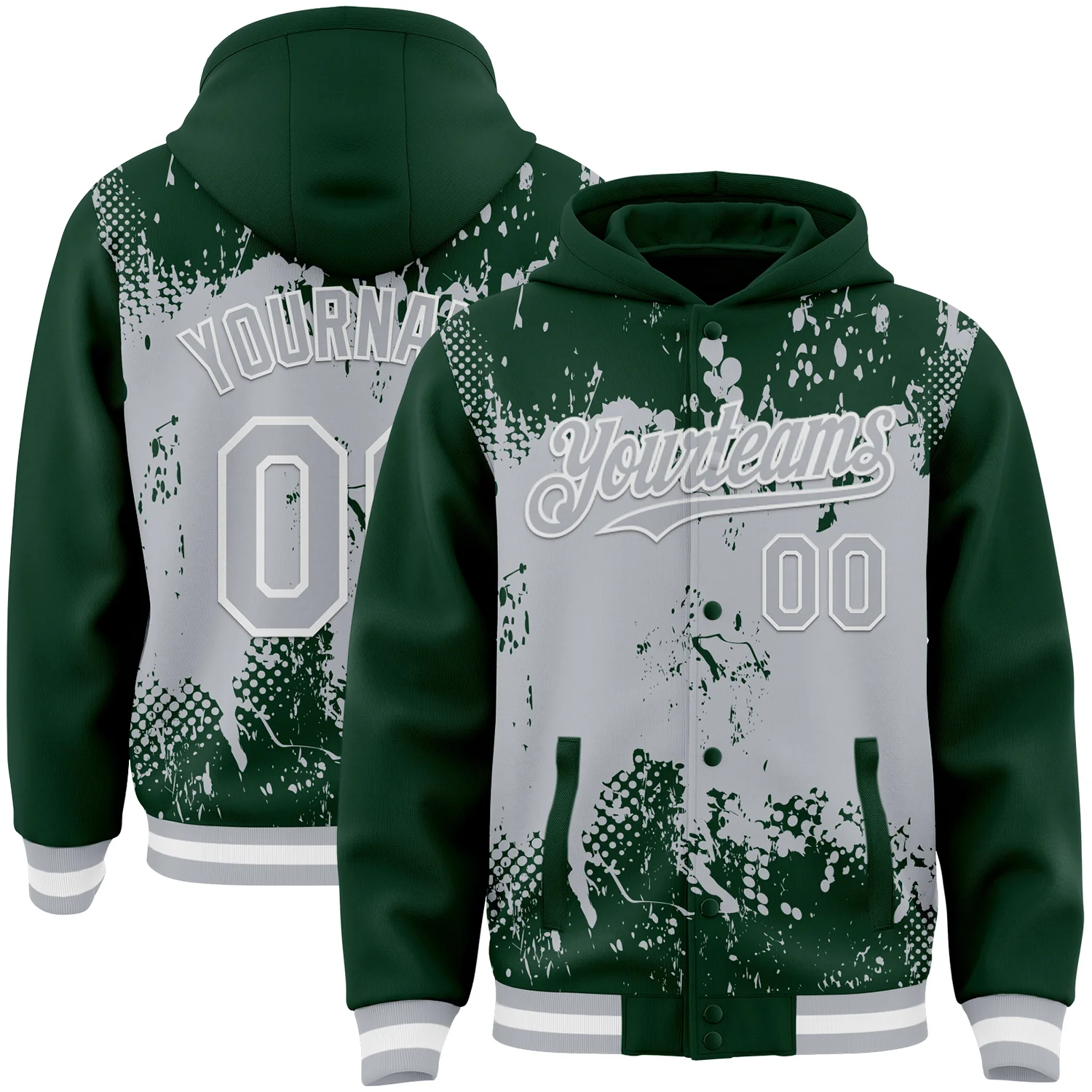 Custom Green Gray-White Splash Art 3D Pattern Design Bomber Full-Snap Varsity Letterman Hoodie Jacket