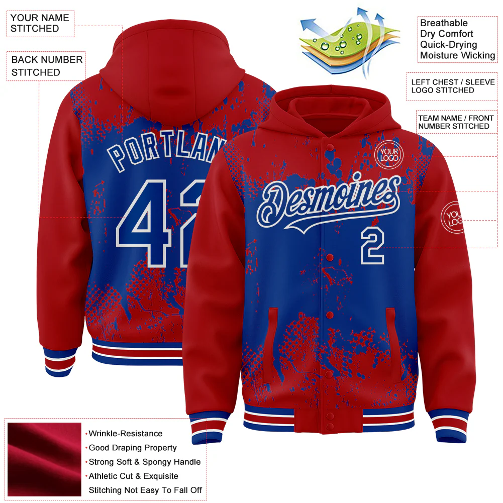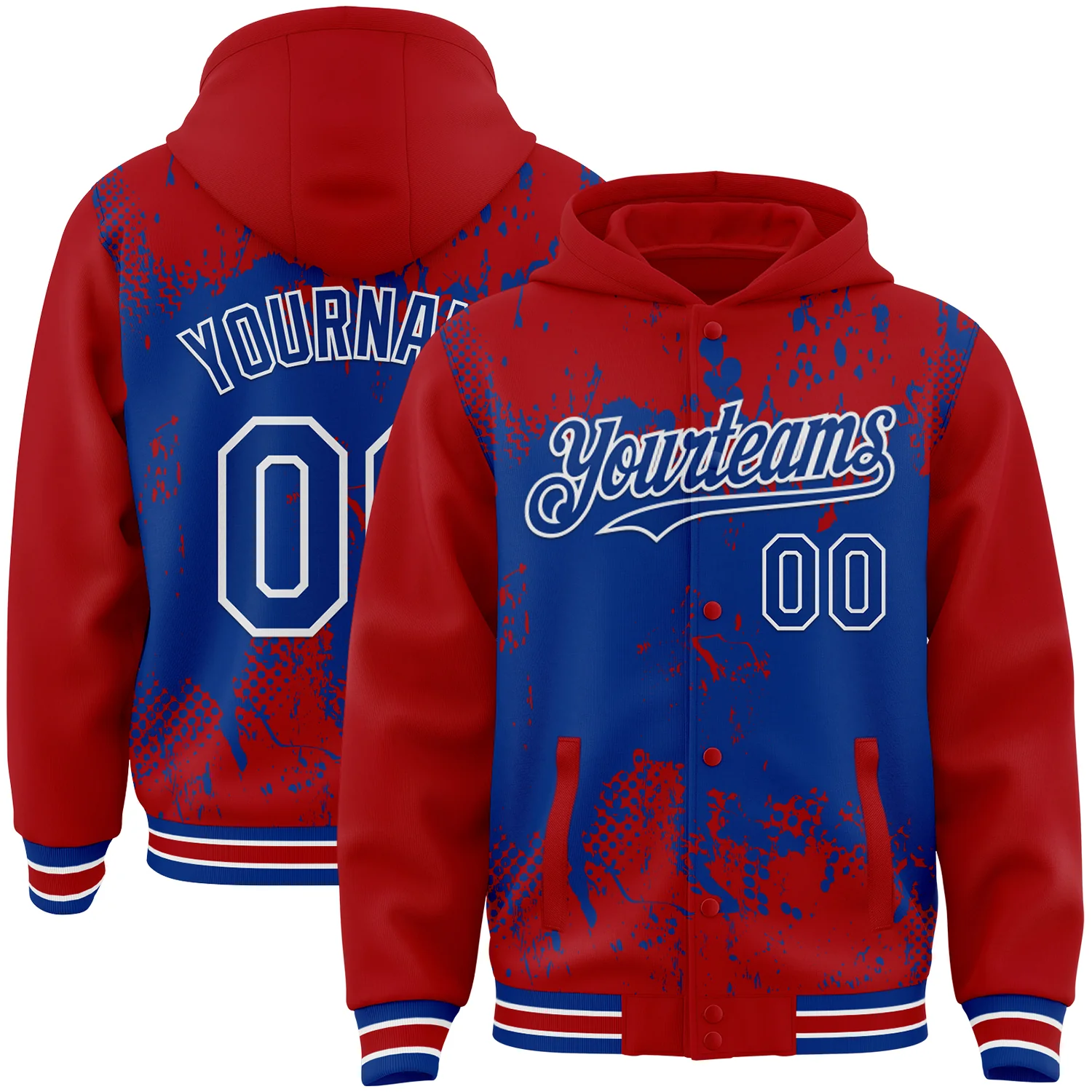 Custom Red Royal-White Splash Art 3D Pattern Design Bomber Full-Snap Varsity Letterman Hoodie Jacket