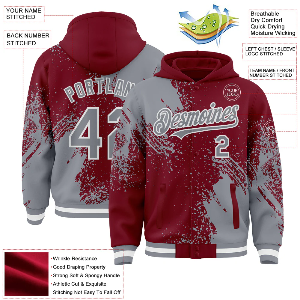 Custom Crimson Gray-White Abstract Brush Stroke 3D Pattern Design Bomber Full-Snap Varsity Letterman Hoodie Jacket
