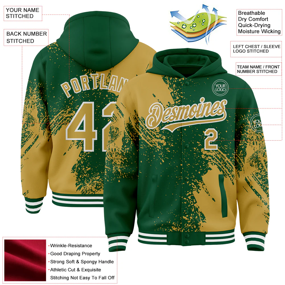 Custom Kelly Green Gold-White Abstract Brush Stroke 3D Pattern Design Bomber Full-Snap Varsity Letterman Hoodie Jacket
