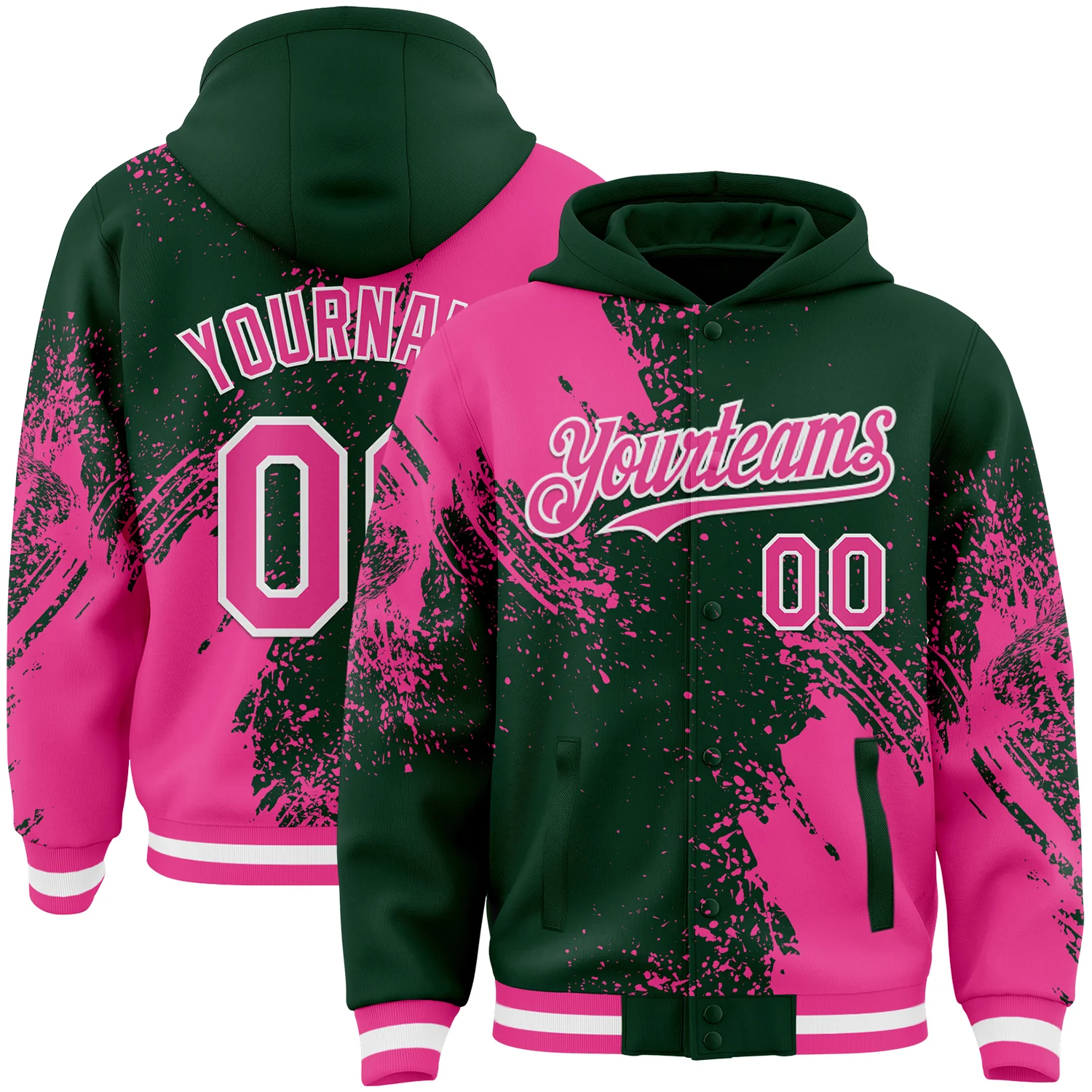 Custom Green Pink-White Abstract Brush Stroke 3D Pattern Design Bomber Full-Snap Varsity Letterman Hoodie Jacket