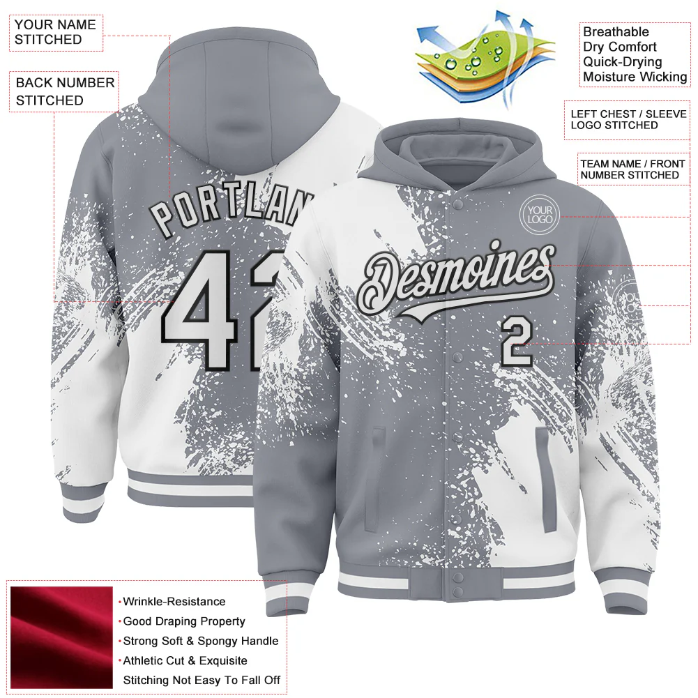 Custom Gray White-Black Abstract Brush Stroke 3D Pattern Design Bomber Full-Snap Varsity Letterman Hoodie Jacket