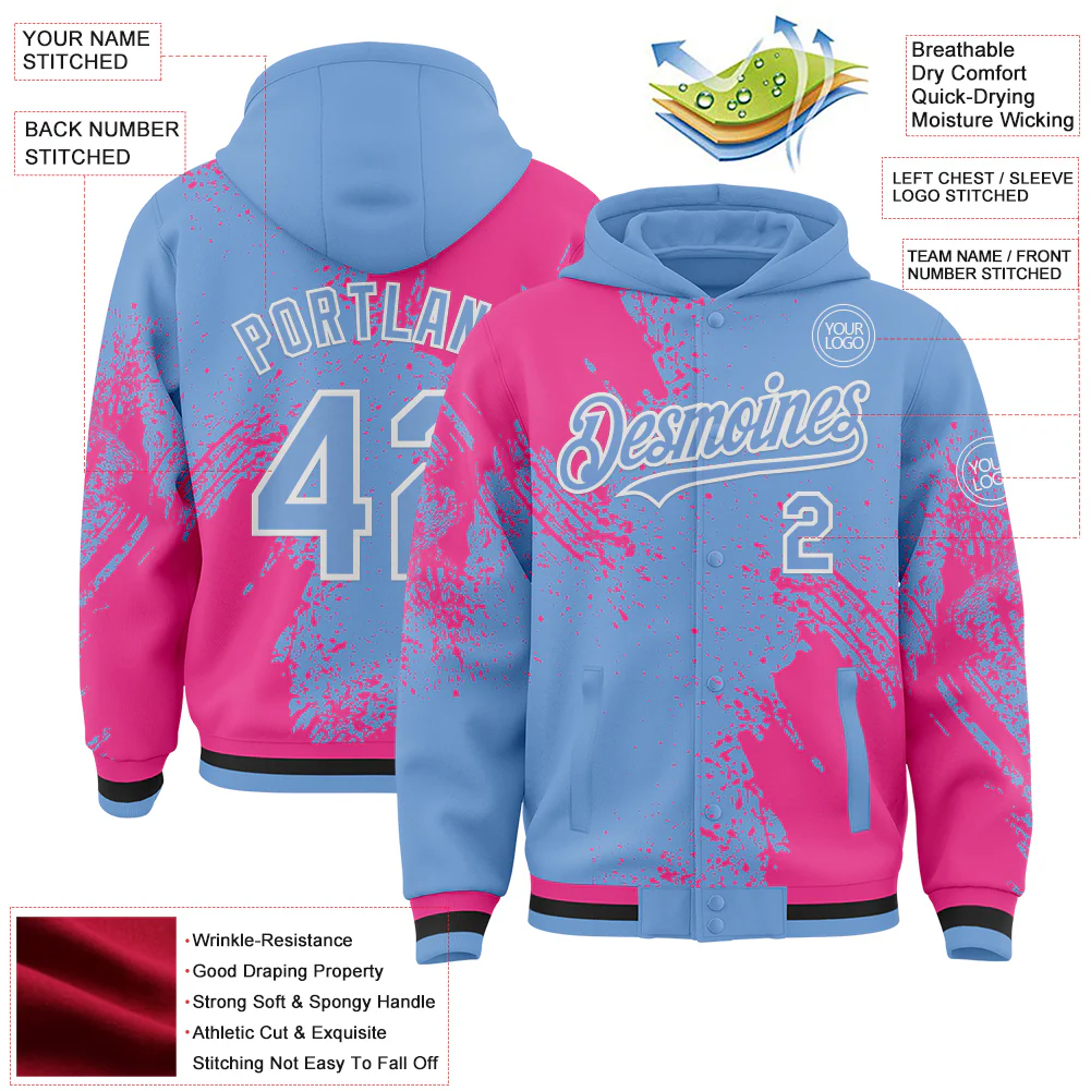 Custom Light Blue Pink-White Abstract Brush Stroke 3D Pattern Design Bomber Full-Snap Varsity Letterman Hoodie Jacket