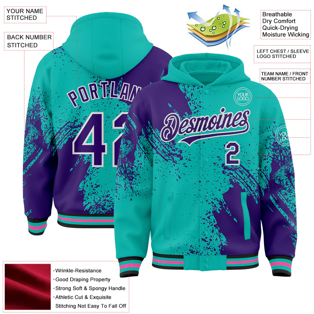 Custom Aqua Purple Black Pink-White Abstract Brush Stroke 3D Pattern Design Bomber Full-Snap Varsity Letterman Hoodie Jacket