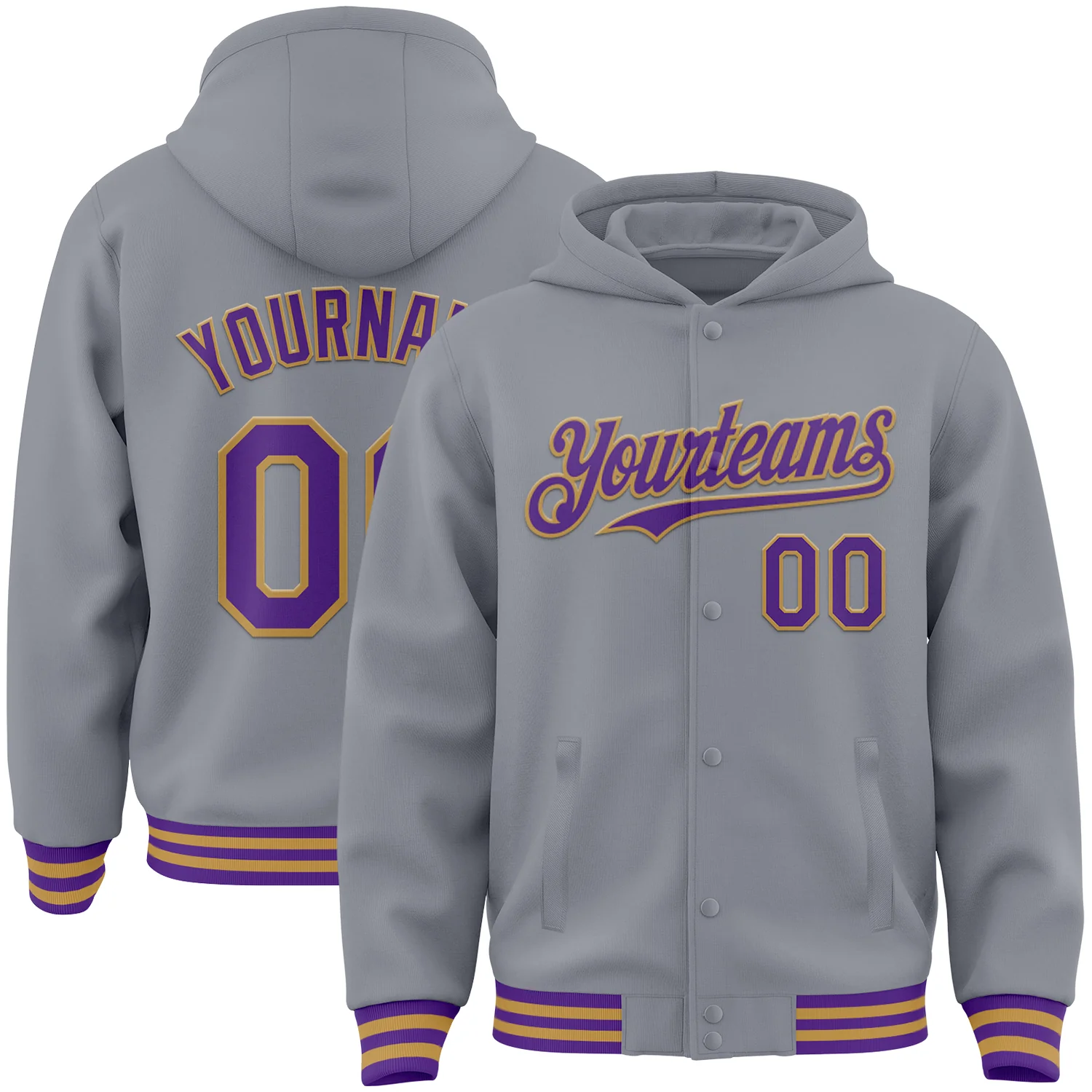 Custom Gray Purple-Old Gold Bomber Full-Snap Varsity Letterman Hoodie Jacket