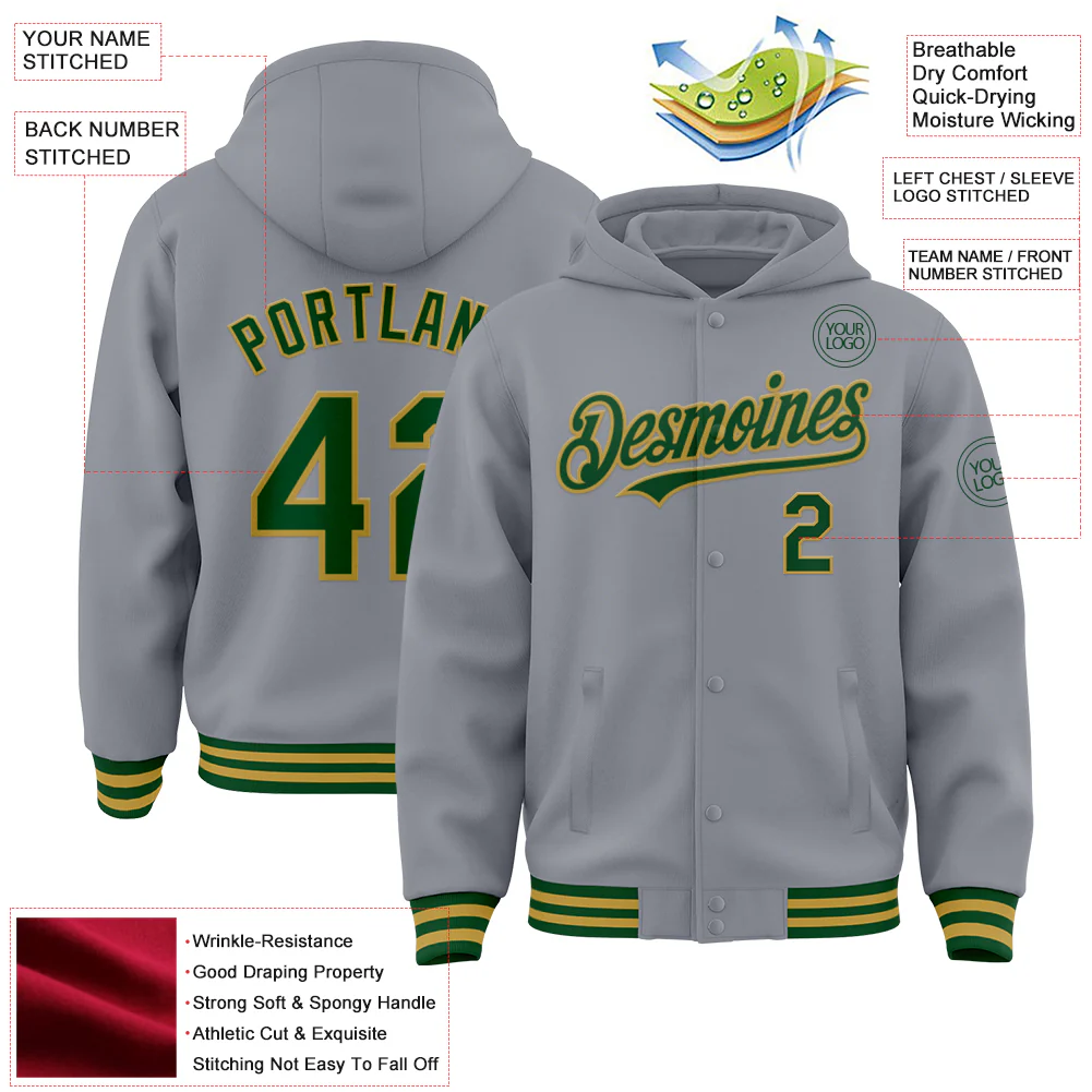 Custom Gray Green-Old Gold Bomber Full-Snap Varsity Letterman Hoodie Jacket