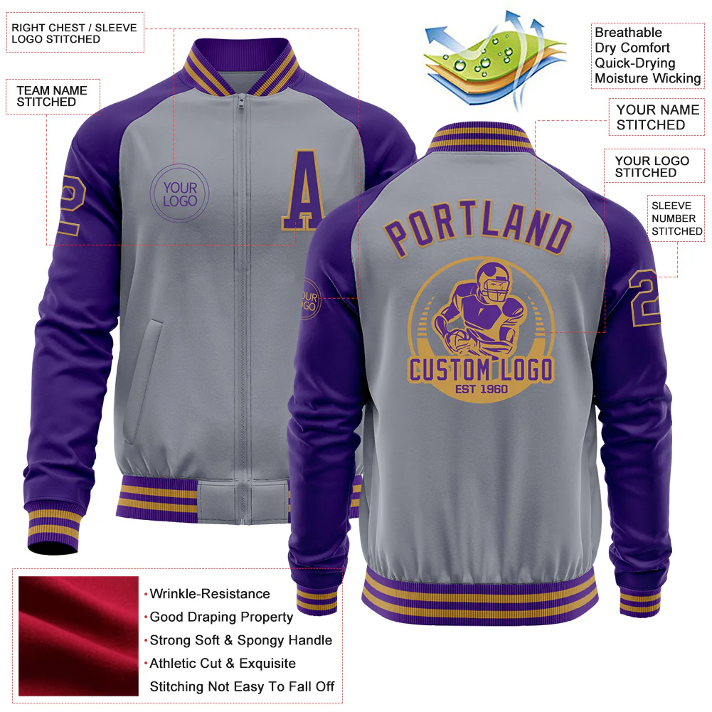 Custom Gray Purple-Old Gold Bomber Varsity Letterman Two Tone Zipper Jacket