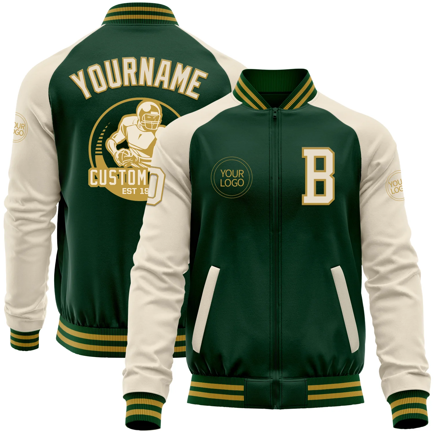 Custom Green Cream-Old Gold Bomber Varsity Letterman Two Tone Zipper Jacket