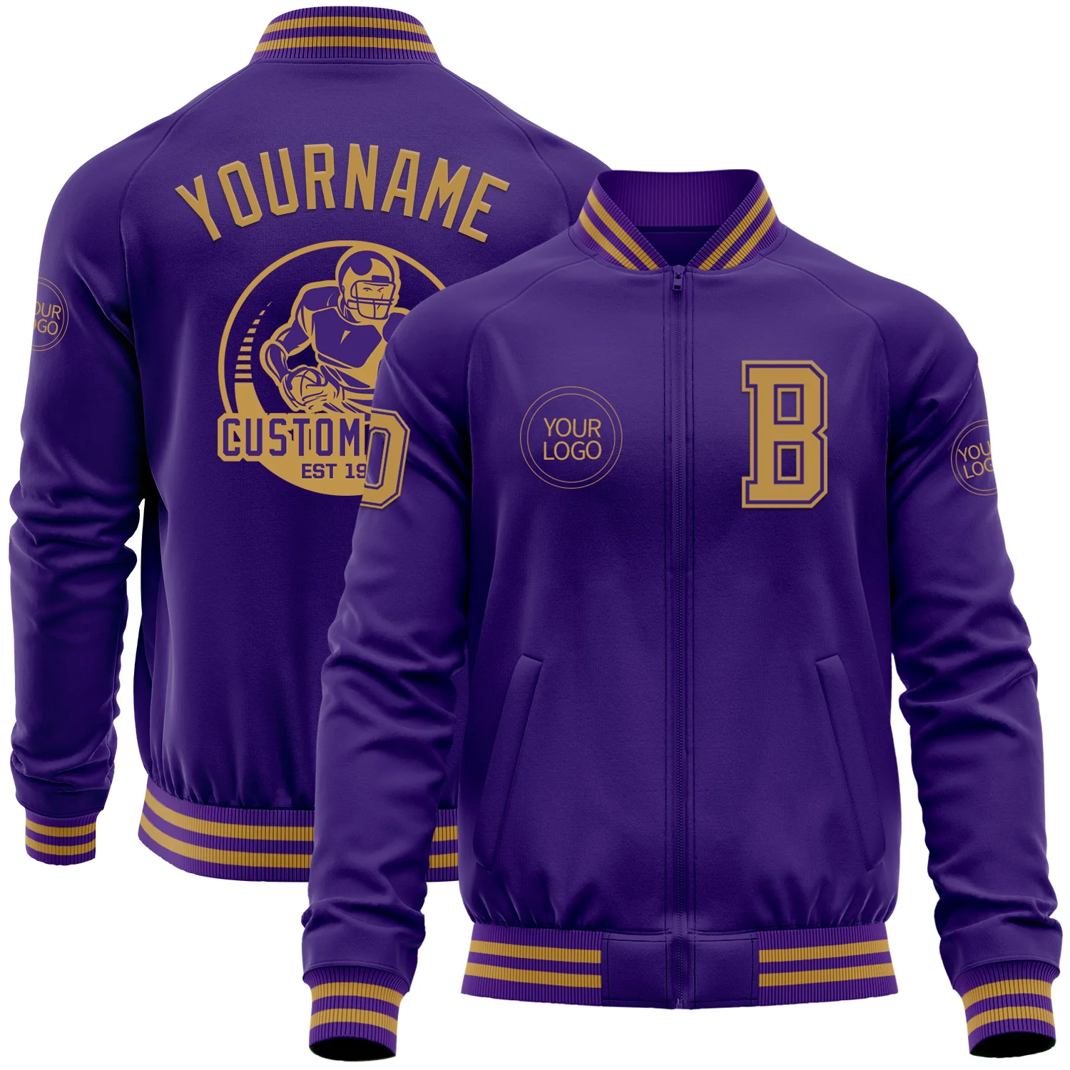 Custom Purple Old Gold Bomber Varsity Letterman Zipper Jacket