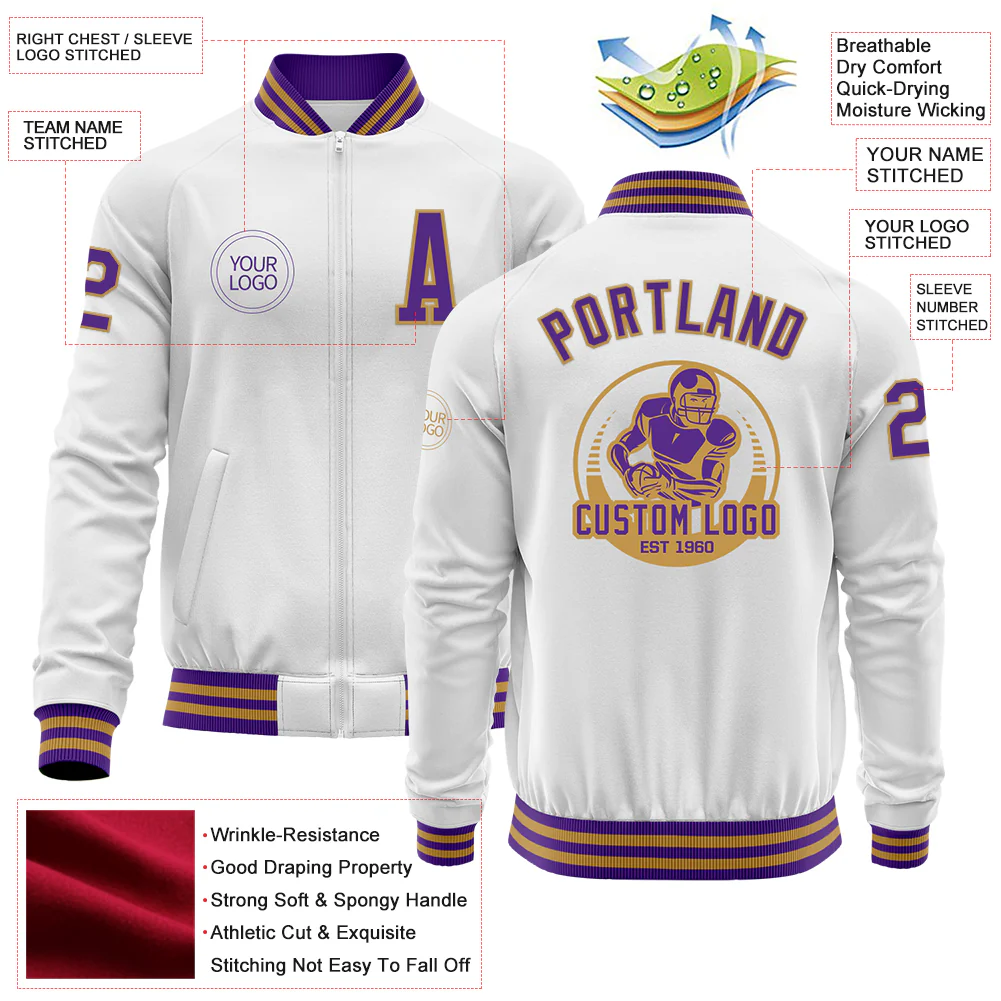Custom White Purple-Old Gold Bomber Varsity Letterman Zipper Jacket