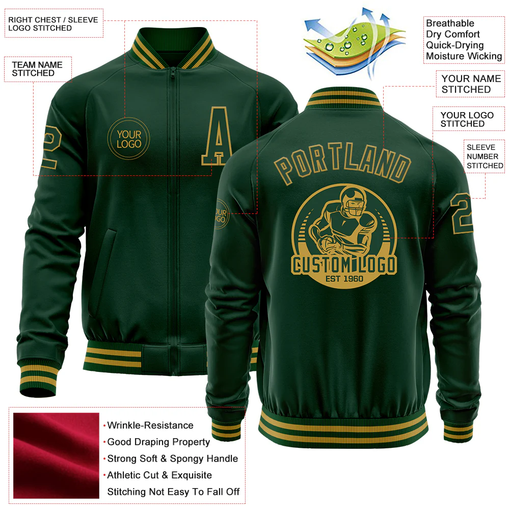 Custom Green Old Gold Bomber Varsity Letterman Zipper Jacket