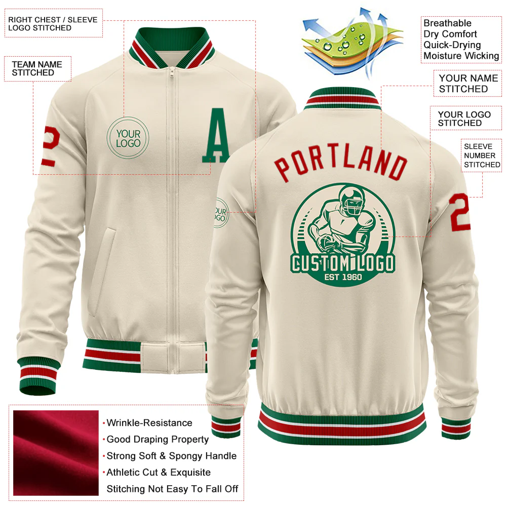 Custom Cream Red Kelly Green-White Bomber Varsity Letterman Zipper Jacket