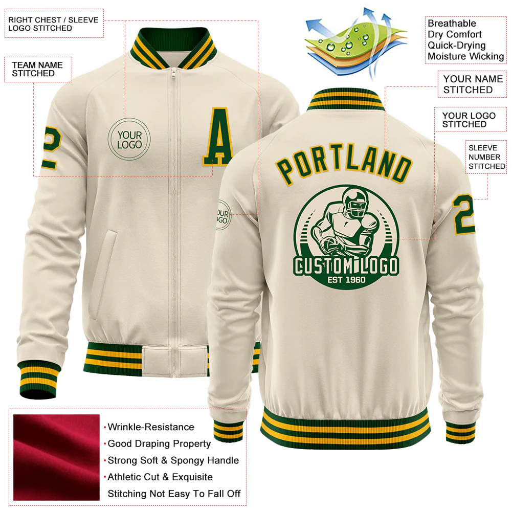 Custom Cream Green-Gold Bomber Varsity Letterman Zipper Jacket