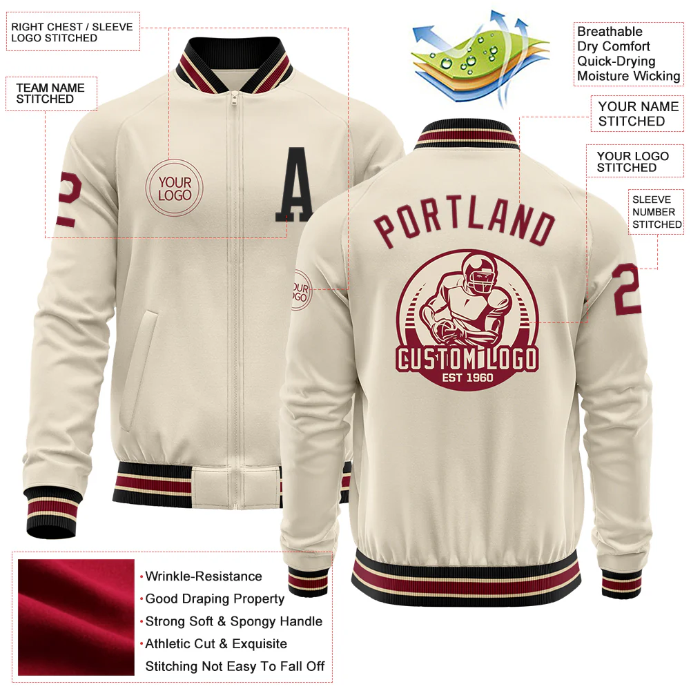 Custom Cream Crimson Black-City Cream Bomber Varsity Letterman Zipper Jacket