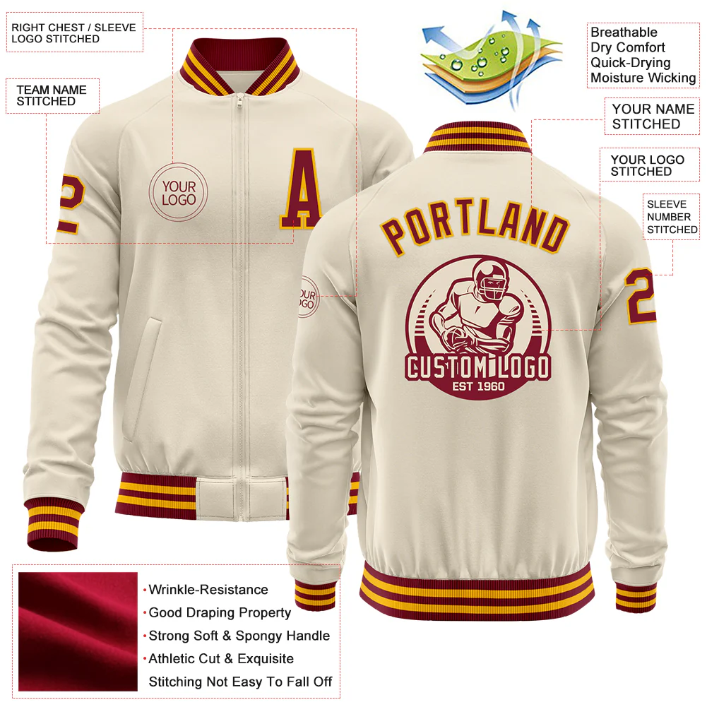 Custom Cream Crimson-Gold Bomber Varsity Letterman Zipper Jacket