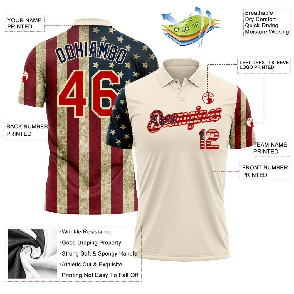 Custom Cream Red-Navy 3D American Flag Performance Golf Polo Shirt