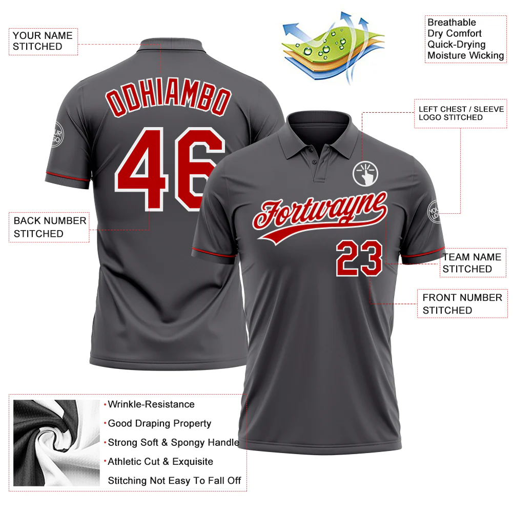 Custom Steel Gray Red-White Performance Vapor Golf Polo Shirt