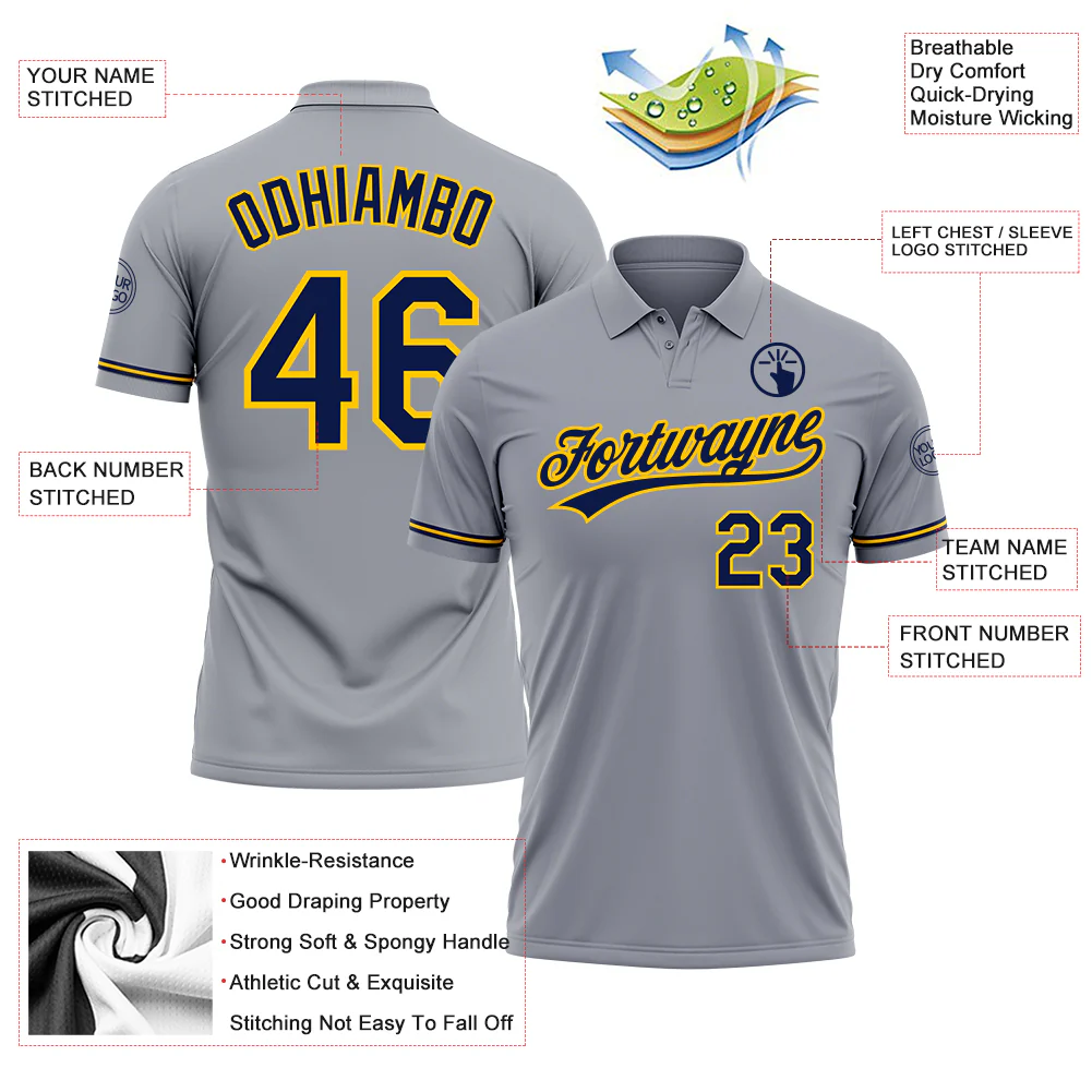 Custom Gray Navy-Yellow Performance Vapor Golf Polo Shirt