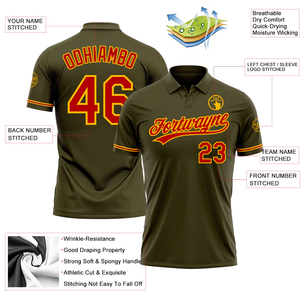 Custom Olive Red-Gold Performance Vapor Salute To Service Golf Polo Shirt