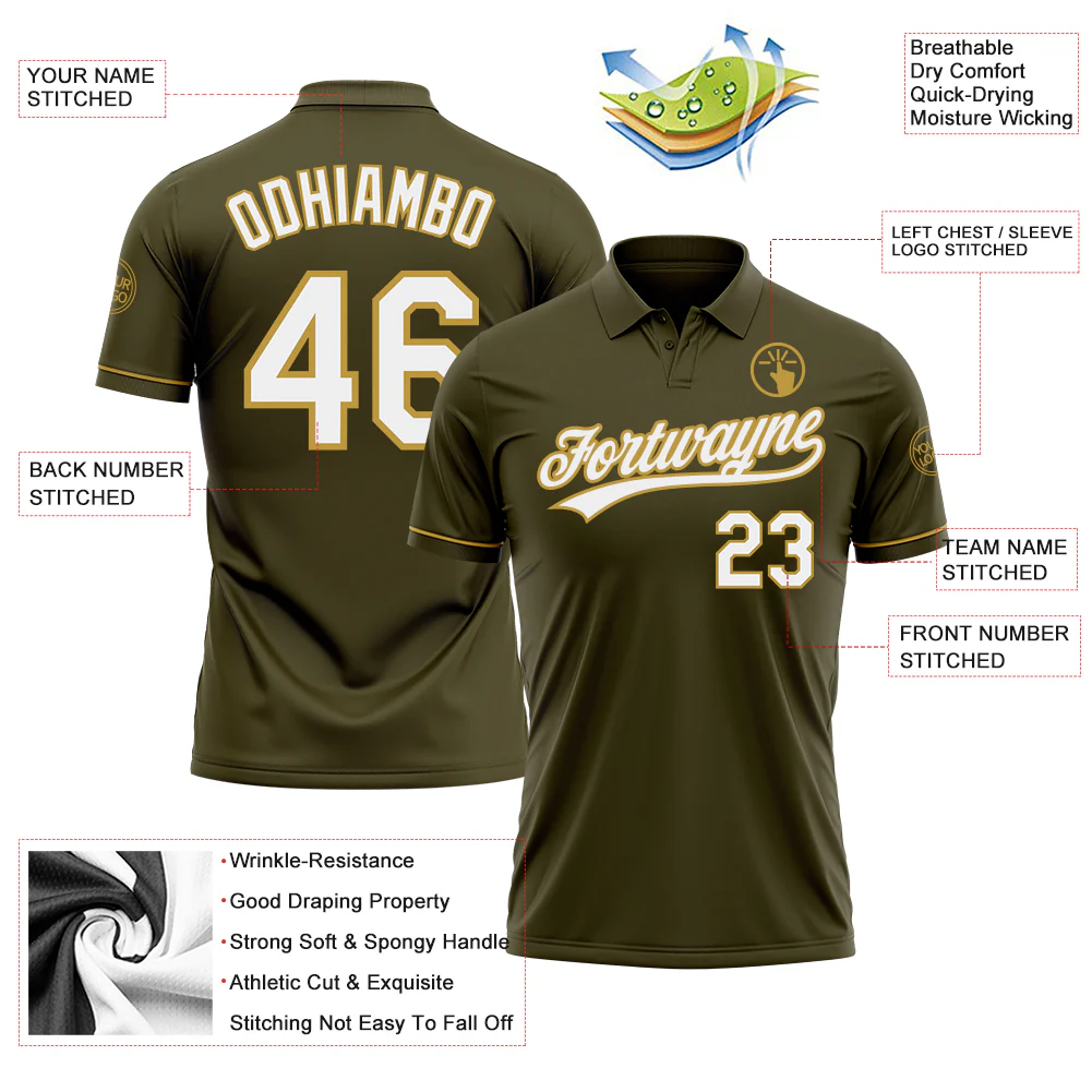 Custom Olive White-Old Gold Performance Vapor Salute To Service Golf Polo Shirt