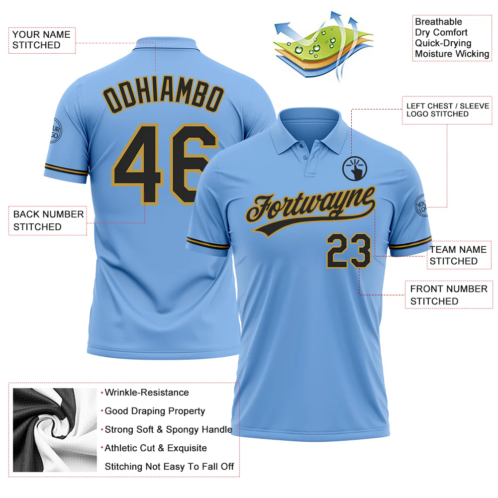 Custom Light Blue Black-Old Gold Performance Vapor Golf Polo Shirt